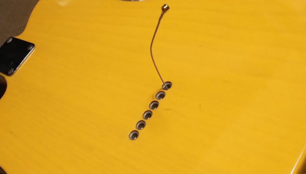 モデルにもよりますが、テレキャスターは横から弦を通すタイプではなく、このようになっています。
