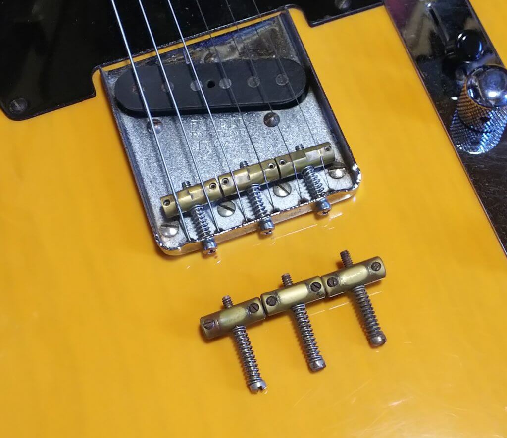 取り付けてあるのがカラハム製、下が純正のブリッジサドルです。